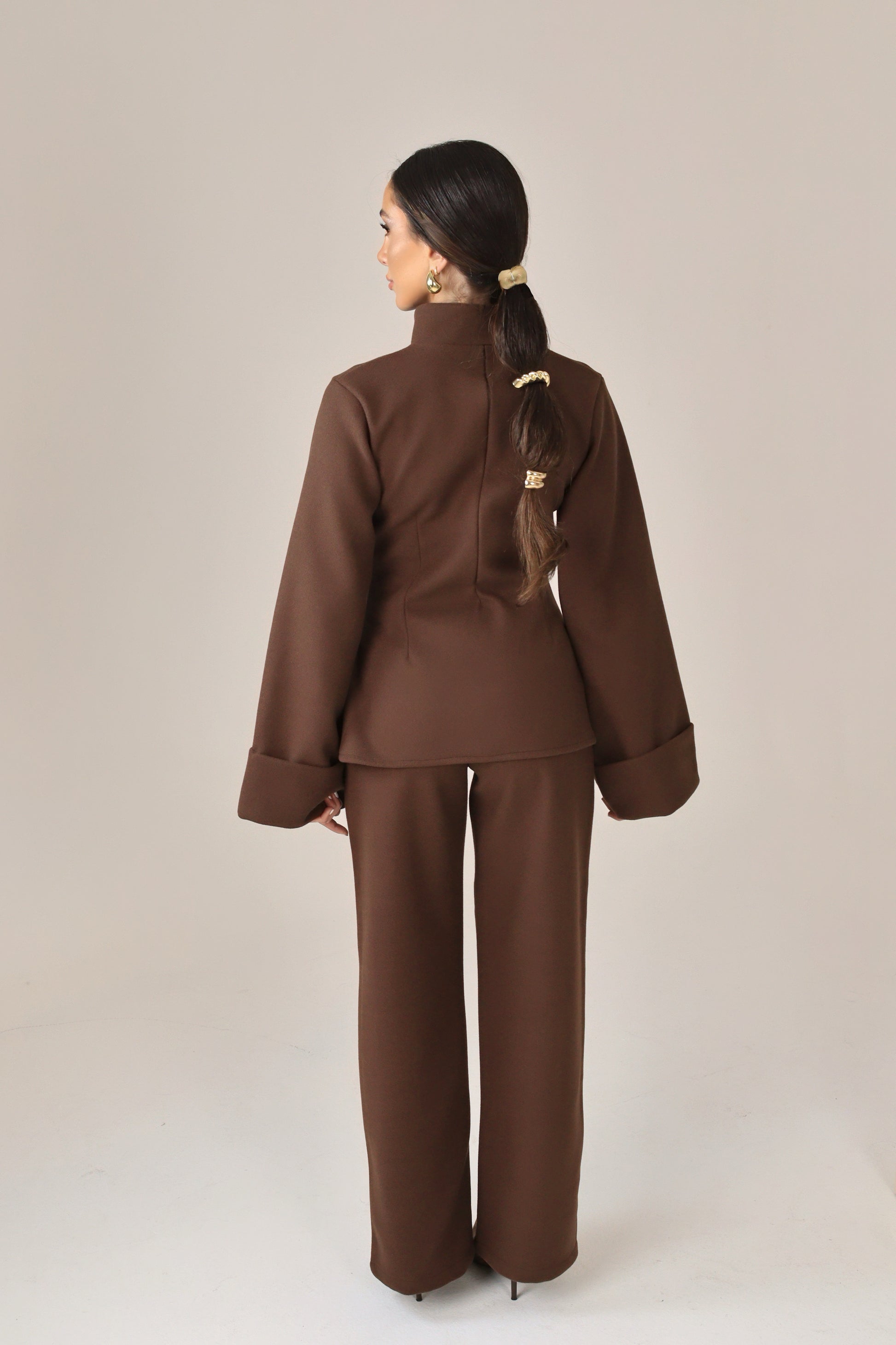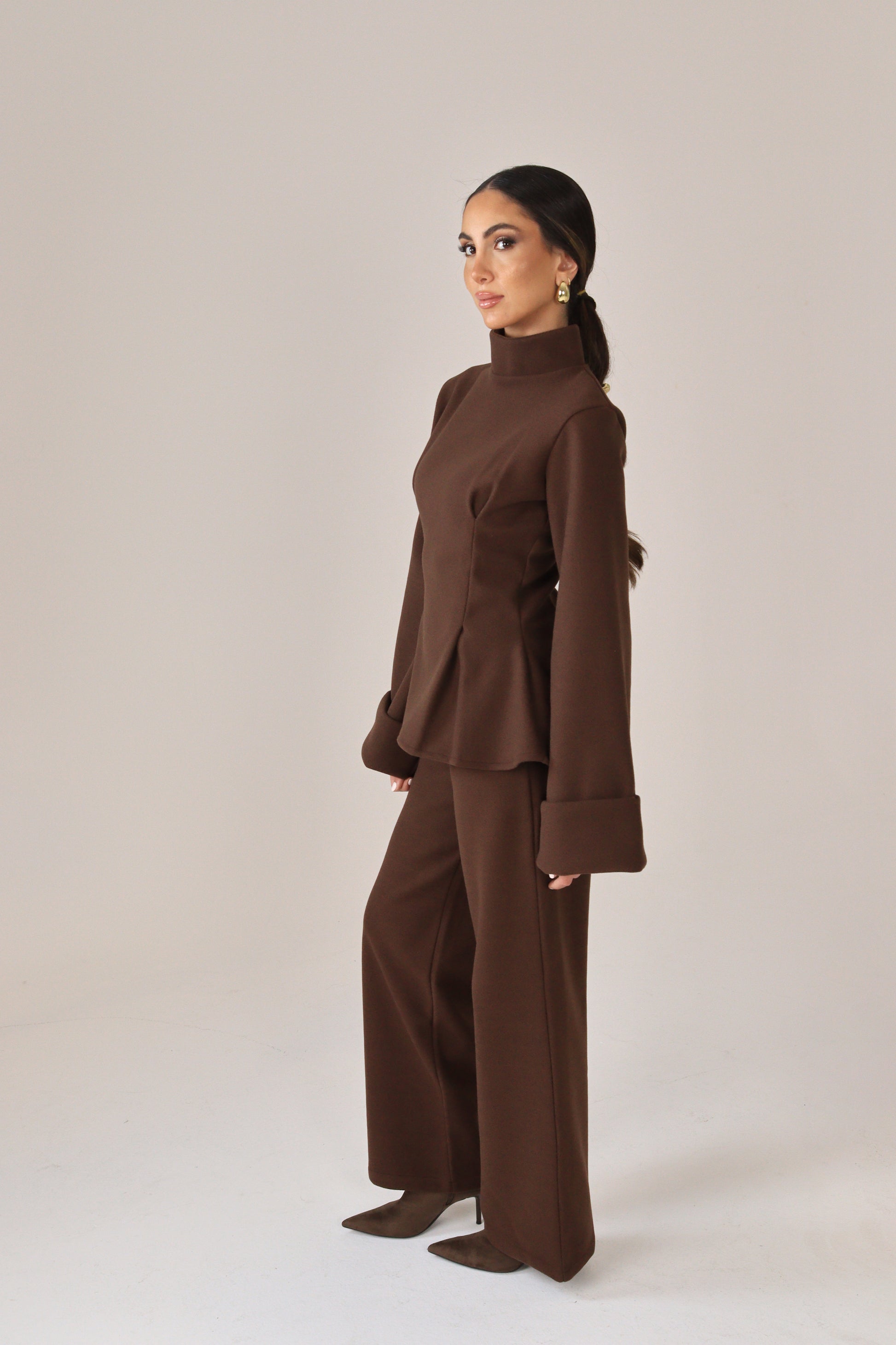 The top features a clean funnel neckline with a soft mock-neck finish, complemented by a concealed back zipper for a seamless fit. Extra-long straight bell sleeves with a wide cuff add quiet drama and balance to the silhouette. Precision-placed darts open at the waist to create a voluminous peplum effect, defining the collection’s signature feminine shape. Matching back darts mirror the design, ensuring elegant contour from every angle.