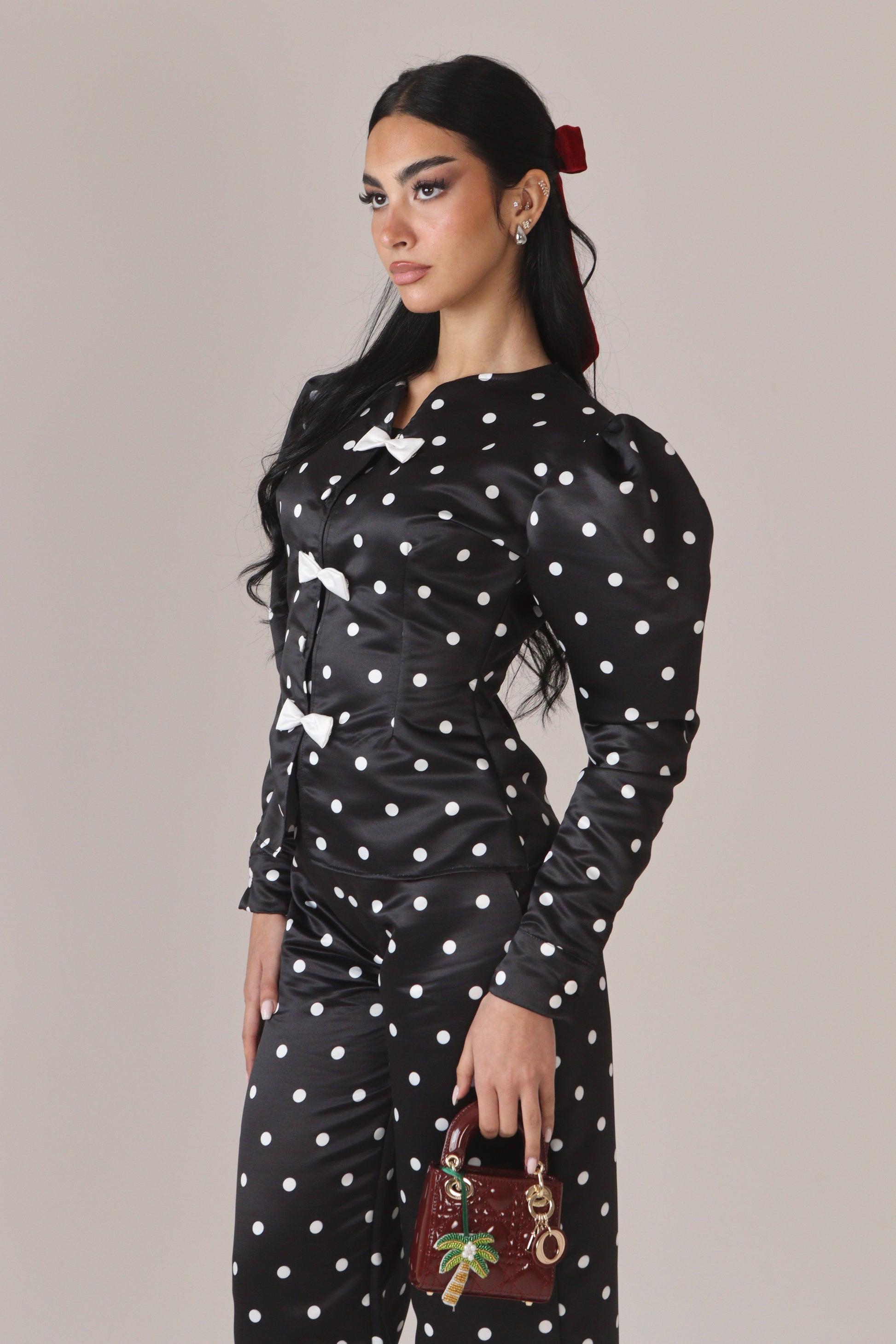 The Andriana Set is crafted from luminous duchess satin, finished with a classic white polka-dot print for a bold yet timeless contrast. Structured and glossy, the fabric gives the set its couture-like presence.