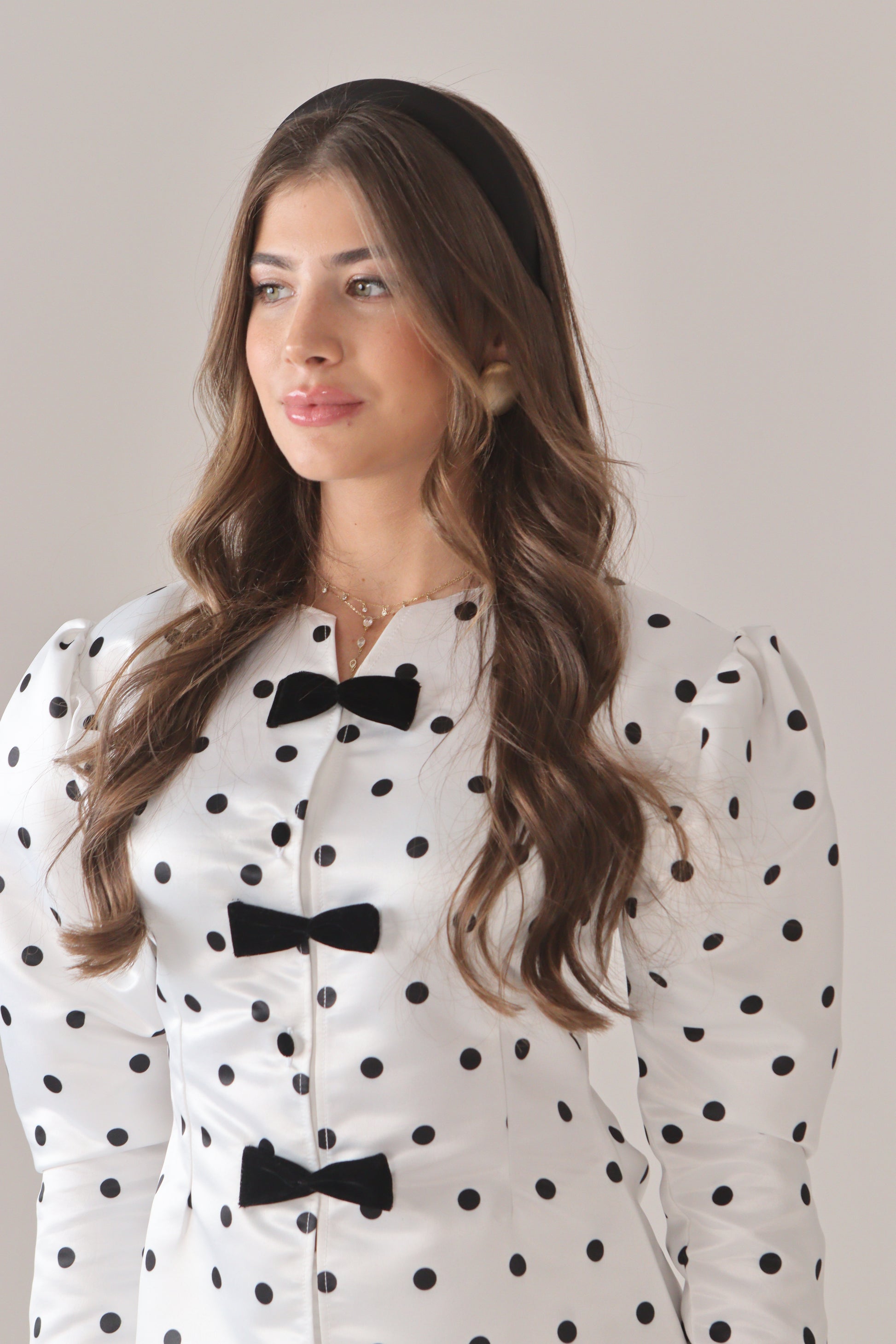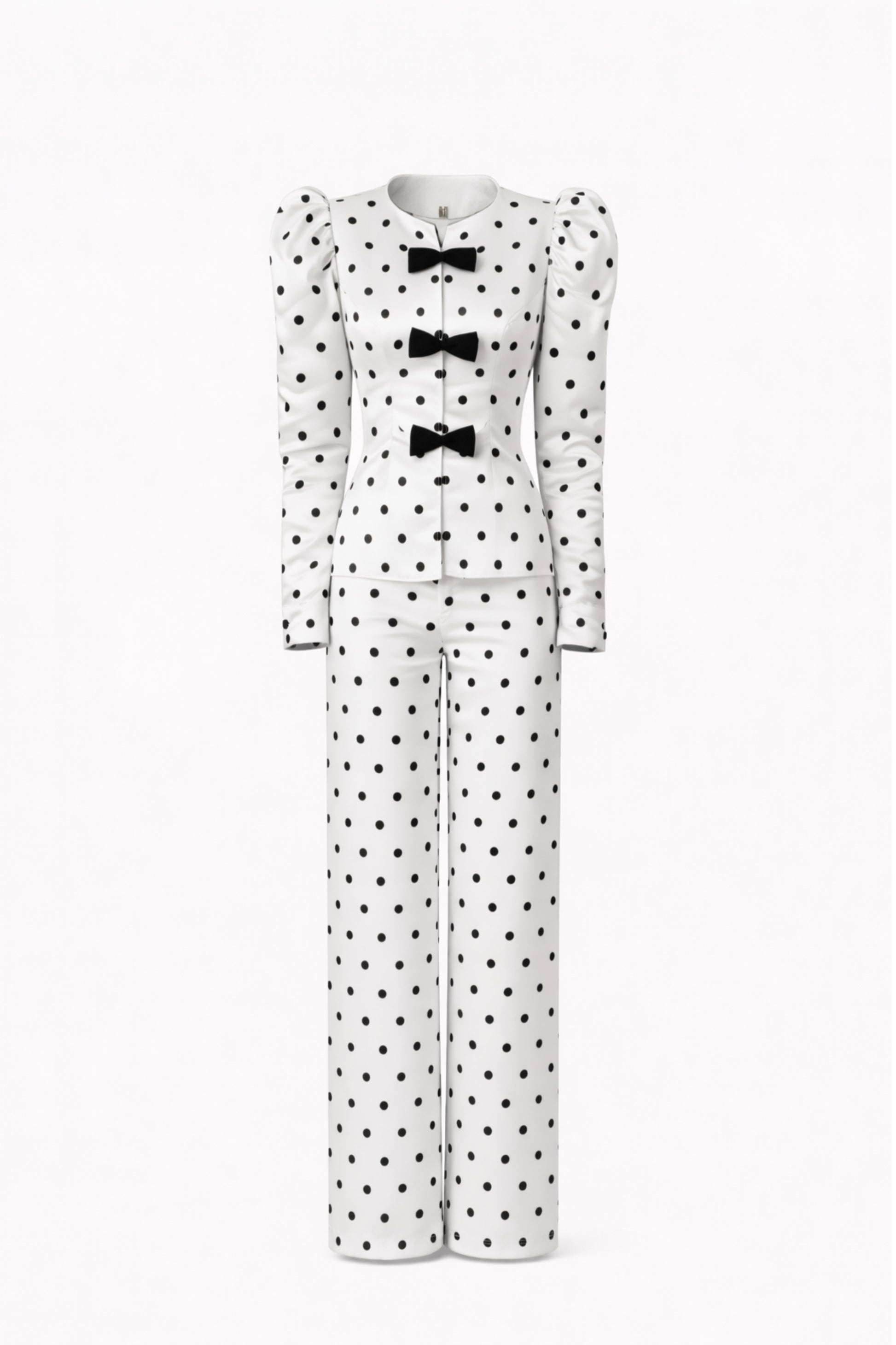The Andriana Set is crafted from luminous duchess satin, finished with a classic black polka-dot print for a bold yet timeless contrast. Structured and glossy, the fabric gives the set its couture-like presence.