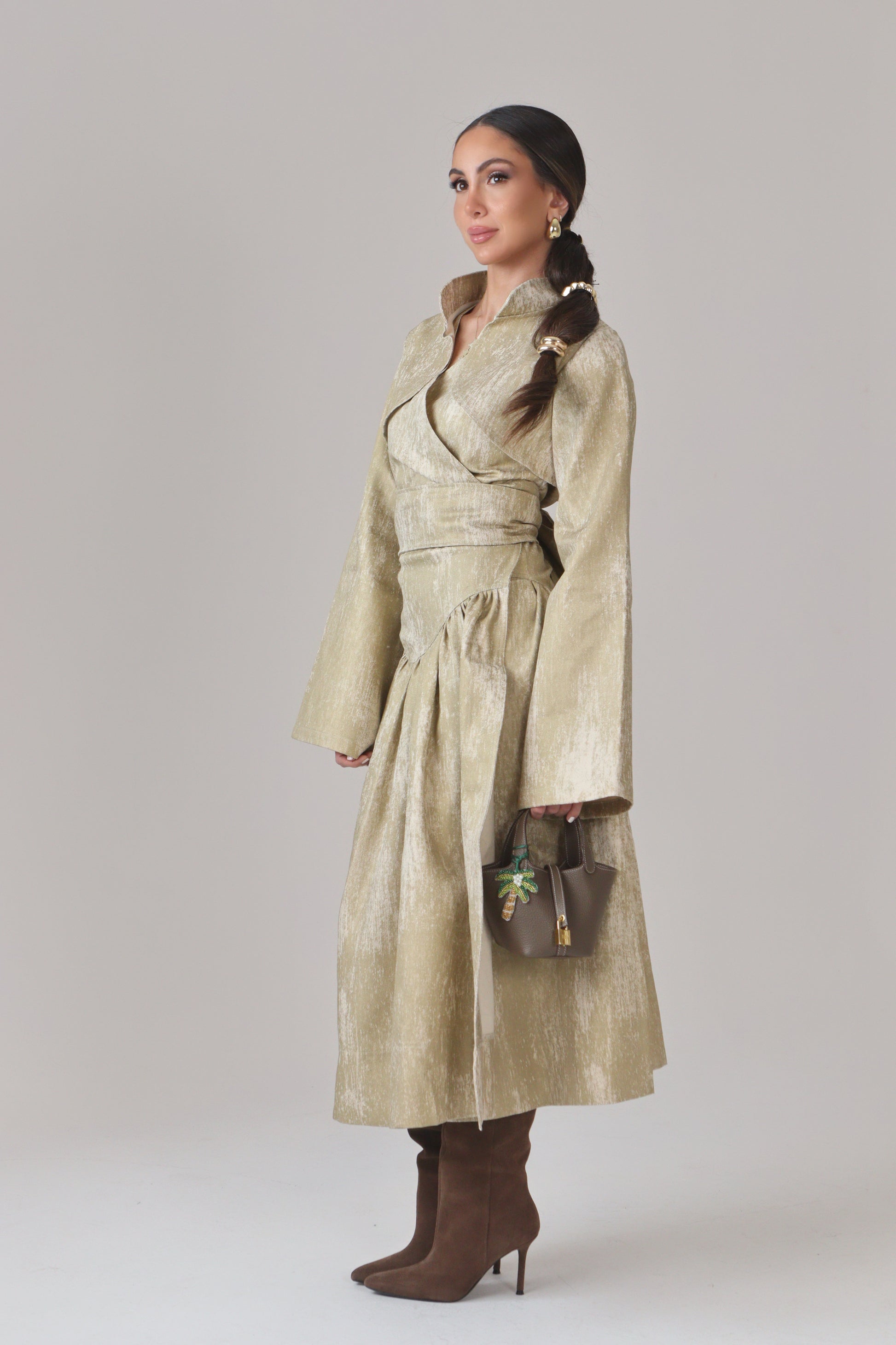 The Automno Dress is a sculptural take on modern femininity, crafted from off-white denim printed almost entirely in a rich bronze-gold finish. Structured yet fluid, the fabric gives the dress its distinctive depth and luminous presence.