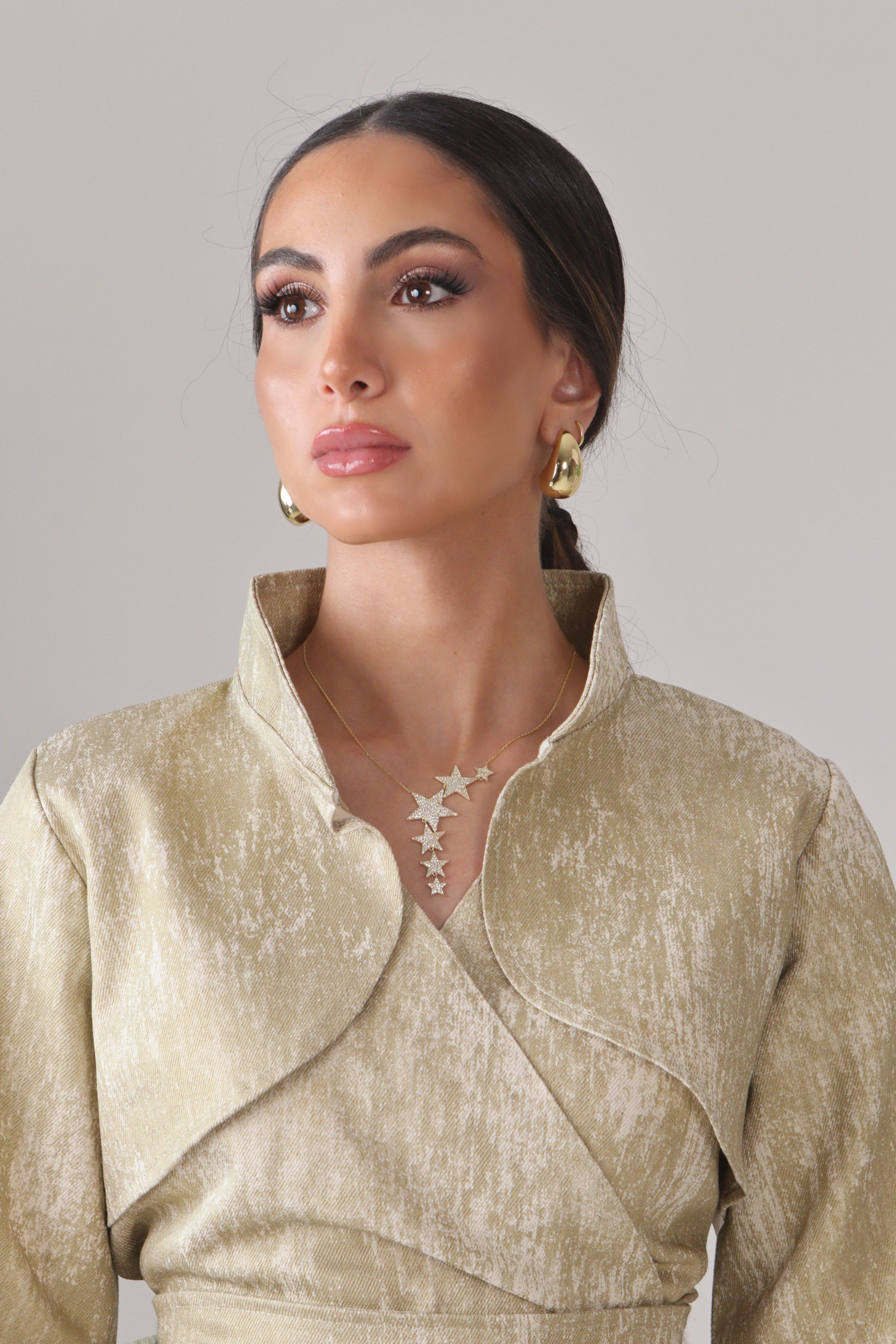 The Automno Bolero Jacket is crafted from 100% cotton off-white denim, entirely printed in a rich gold finish that gives the piece its luminous, statement-making character. Structured yet striking, the fabric elevates the silhouette with depth and shine.