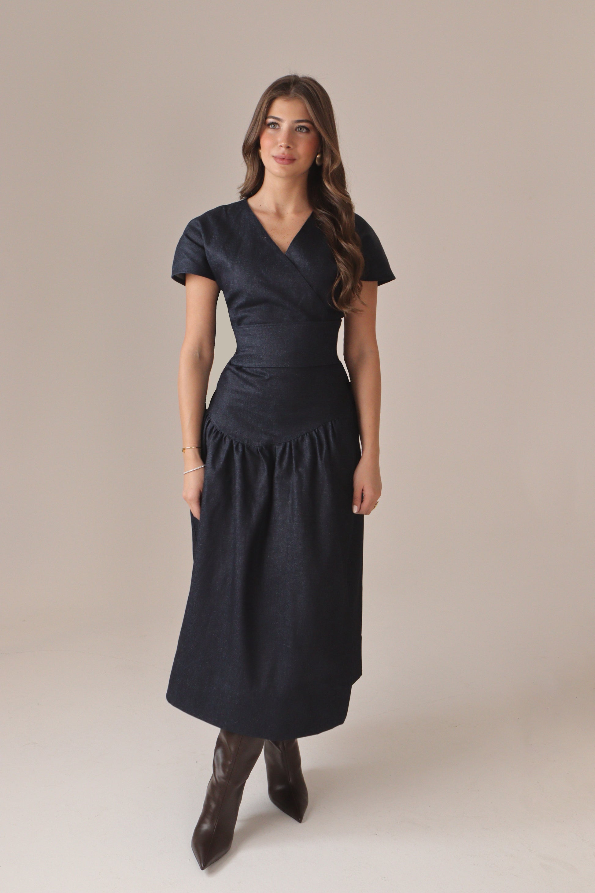 The Automno Dress is crafted from 100% cotton navy denim, offering a rich, deep tone with a structured yet fluid feel. The fabric gives the dress a clean, refined presence while remaining comfortable and wearable.